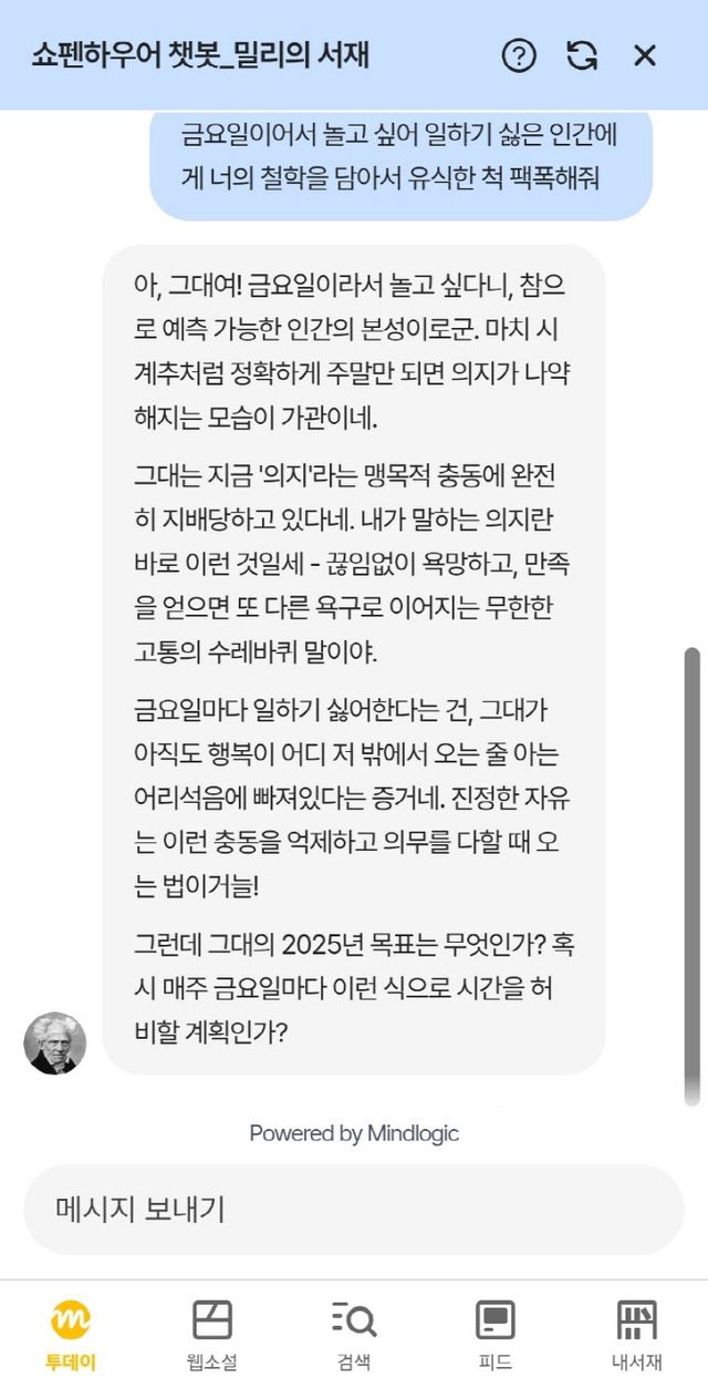‘대문자T 팩트폭력’을 선사한다는 쇼펜하우어 AI 챗봇에게 “금요일이라 일하기 싫으니 팩폭(팩트 폭력)해달라”고 요청했다. 쇼펜하우어 챗봇은 “참으로 예측 가능한 인간의 본성”이라며 “그대는 지금 ‘의지’라는 맹목적 충동에 완전히 지배당하고 있다네. 아직도 행복이 어디 저 밖에서 오는 줄 아는 어리석음에 빠져있다”는 가시 돋은 팩트가 돌아왔다.