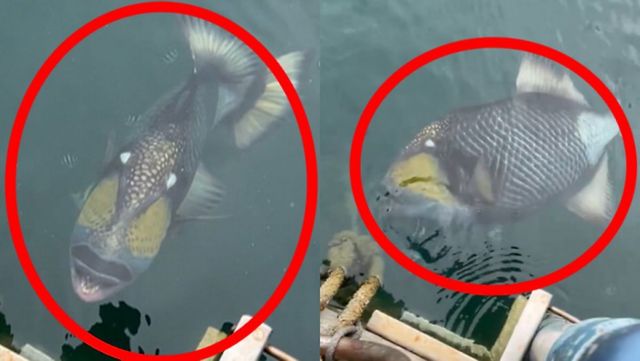 오키나와현 구기가미촌 항구에서 목격된 제왕쥐치복. / 엑스(@sakananomikata) 캡처