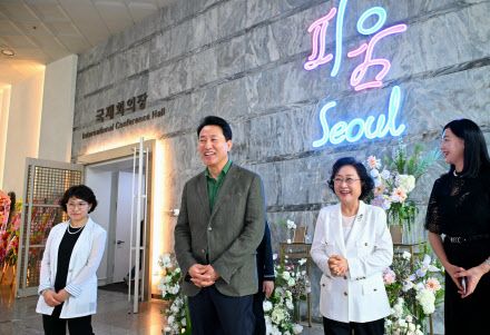 오 시장은 화촉을 밝히고 부부의 연을 맺는 모든 이들의 밝은 미래를 바라며 피움서울 현판 조명을 점등했다. 이어 결혼식장 내부를 살폈다.