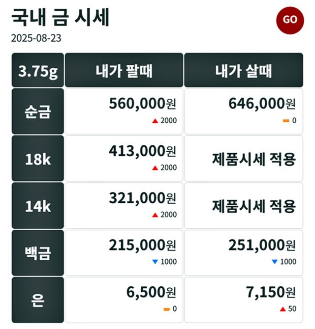 순금(24K) : 매입가 64만 6000원 / 매도가 56만 원