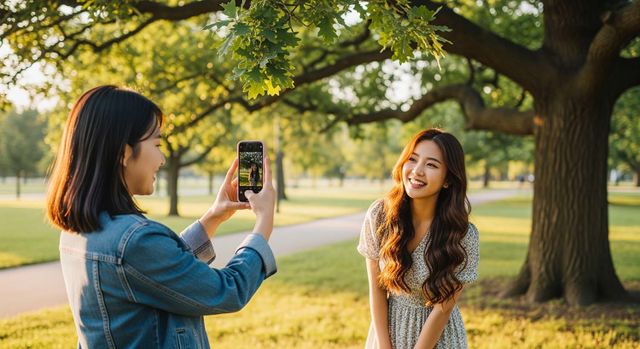 전신 사진을 예쁘게 찍고 싶다면 스마트폰을 뒤집는 방법이 있다. 그는 “렌즈가 아래쪽으로 향하면서 로앵글 효과가 생겨 다리가 길어 보인다”고 했다. 하지만 무턱대고 뒤집기만 해선 소용이 없다. 얼굴은 화면 위쪽, 다리는 가운데 쪽에 위치시켜야 자연스럽게 길어 보이는 비율이 나온다. 필요하면 편집으로 여백을 잘라내면 된다고 설명했다.