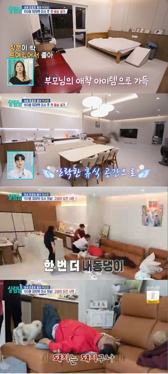 이날 박서진은 부모님을 위해 지은 150평 대저택으로 이사한 뒤 첫 날을 보냈다.