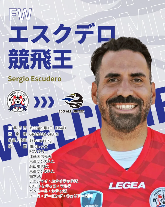 1988년생으로 생일이 지나면 37세가 되는 그는 고국 일본 무대에서 선수 생활 황혼기를 보내고 커리어를 마무리할 가능성이 커 보인다. 에스쿠데로는 이름에서 짐작할 수 있듯 스페인 출신이지만 지난 2007년 일본 국적을 취득, 일본 23세 이하(U-23) 대표팀에서도 활약한 경력이 있는 일본 선수다.