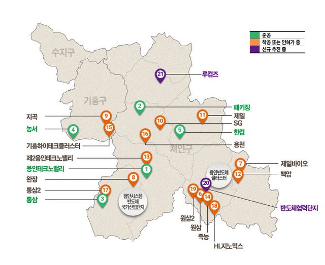 용인엔 이미 세계 5대 반도체 장비업체 가운데 램리서치코리아가 지곡 일반산단 내에 용인캠퍼스를 완성해 가동 중이며, 도쿄일렉트론코리아는 원삼 일반산단과 제2용인테크노밸리 등에 부지를 확보하고 R&D센터 신축 사업에 들어갔다. 최대 반도체 장비업체인 ASML은 용인반도체클러스터 협력화단지 입주를 확정한 상태다.