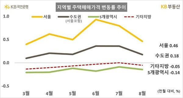 24일 KB부동산의 '8월 전국 주택가격 동향'에 따르면 지난 11일 기준 전국 주택 매매가격 변동률은 한 달 전보다 0.04% 상승했다. 수도권 주택 매매가격은 0.18% 오르면서 6개월 연속 올랐다.
