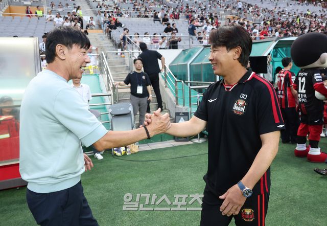 경기 전 신태용 감독과 김기동 감독이 손을 맞잡고 인사하고 있다.