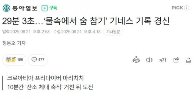 29분 3초…‘물속에서 숨 참기’ 기네스 기록 경신|동아일보