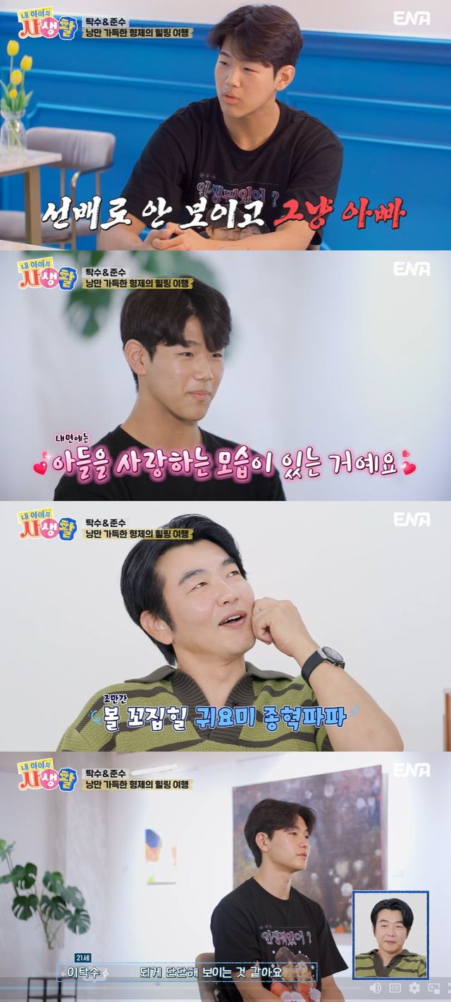 특히 탁수는 아빠 이종혁에 관해 "선배로서는 되게 단단한 사람이다"라며 "남들한테 판단을 받는 직업인데 그런 거에 휘둘리지 않고 자기 거를 해내려는 모습들이 단단해 보이는 것 같다"라고 전해 눈길을 끌었다.