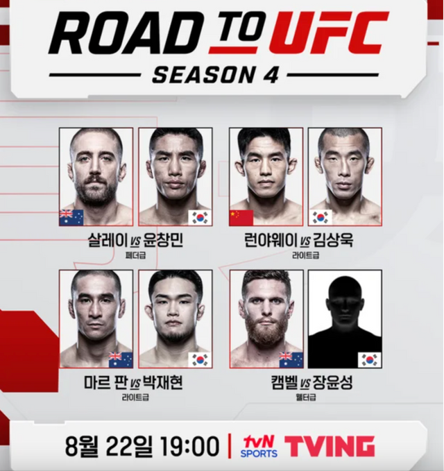 ROAD TO UFC 시즌4 준결승은 8월 22일 오후 7시 tvN SPORTS와 TVING을 통해 생중계됩니다.