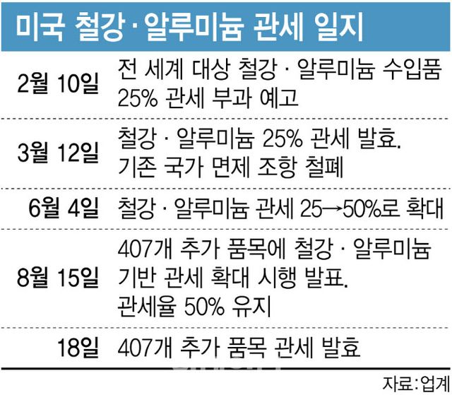 트럼프 행정부는 지난 2월 전 세계 철강·알루미늄 수입품에 25% 관세를 부과한 데 이어 6월에는 이를 50%로 인상했다. 여기에 지난 18일부터는 냉장고, 변압기, 트랙터, 엘리베이터, 전선·케이블 등 철강·알루미늄이 들어가는 파생상품 407종에까지 50% 관세를 확대 적용하고 있다.