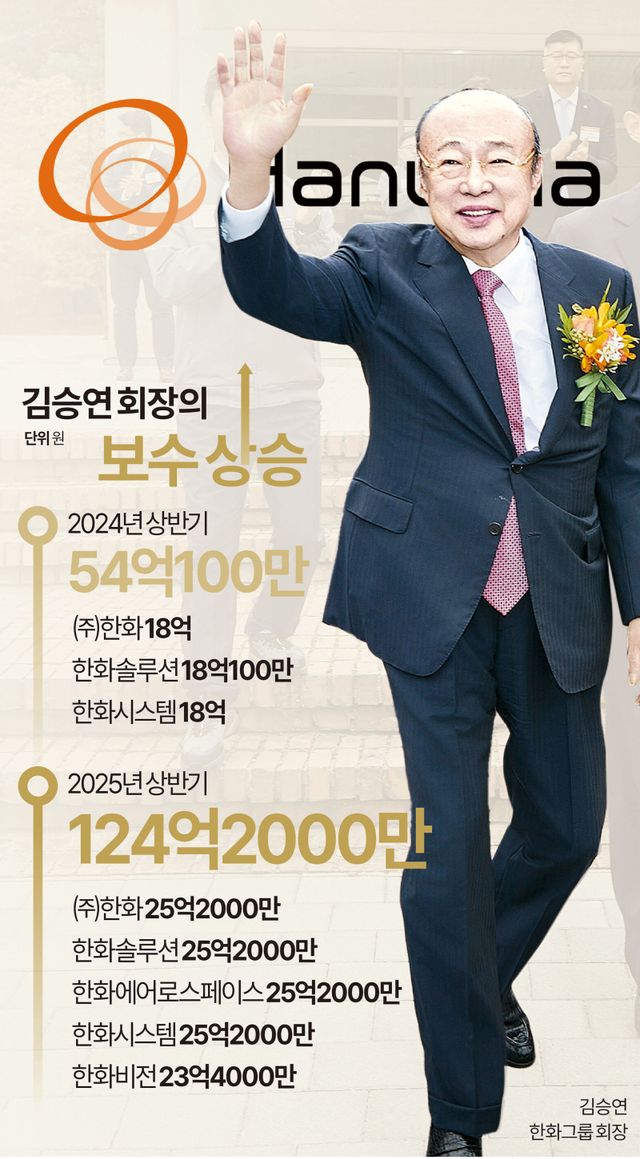 총수들의 상반기 보수가 공개됐다. 상반기 보수는 지난해 성과에 따른 상여금을 포함하고 있어 규모가 크다. 특히 김승연 한화그룹 회장은 1년 새 보수가 2.3배나 급등해 관심을 끌었다. 국내 방산 대표주인 한화에어로스페이스의 최대 수혜자로 김승연 회장이 지목되고 있다.