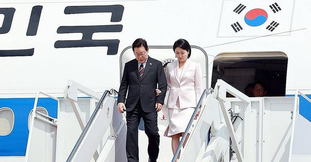 이재명 대통령과 김혜경 여사가 24일(현지시간) 미국 워싱턴DC 인근 앤드루스 합동기지에 도착해 공군 1호기에서 내리고 있다 / 연합뉴스