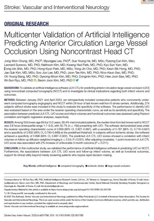 뉴시스 보도에 따르면, 조영제 없이 촬영하는 비조영 CT(NCCT) 영상만으로 전방순환 대혈관 폐색(LVO)을 신속·정확하게 예측하는 JLK-CTL의 성능 검증 연구 결과가 SCI급 국제 학술지 ‘Stroke: Vascular and Interventional Neurology’ 최신호에 게재됐다.
