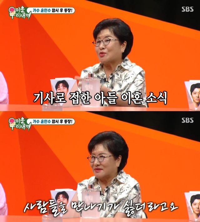 이에 윤민수의 모친은 "기사 보고 알았다. 아들 (SNS에) 매일 내가 들어가서 보는데 그거 보고 알았다"고 고백했다. 서장훈은 "굉장히 놀랐겠다"며 그를 헤아렸고, 윤민수의 어머니는 "나가기가 싫더라. 사람들 만나기가 싫더라"라고 이야기했다.