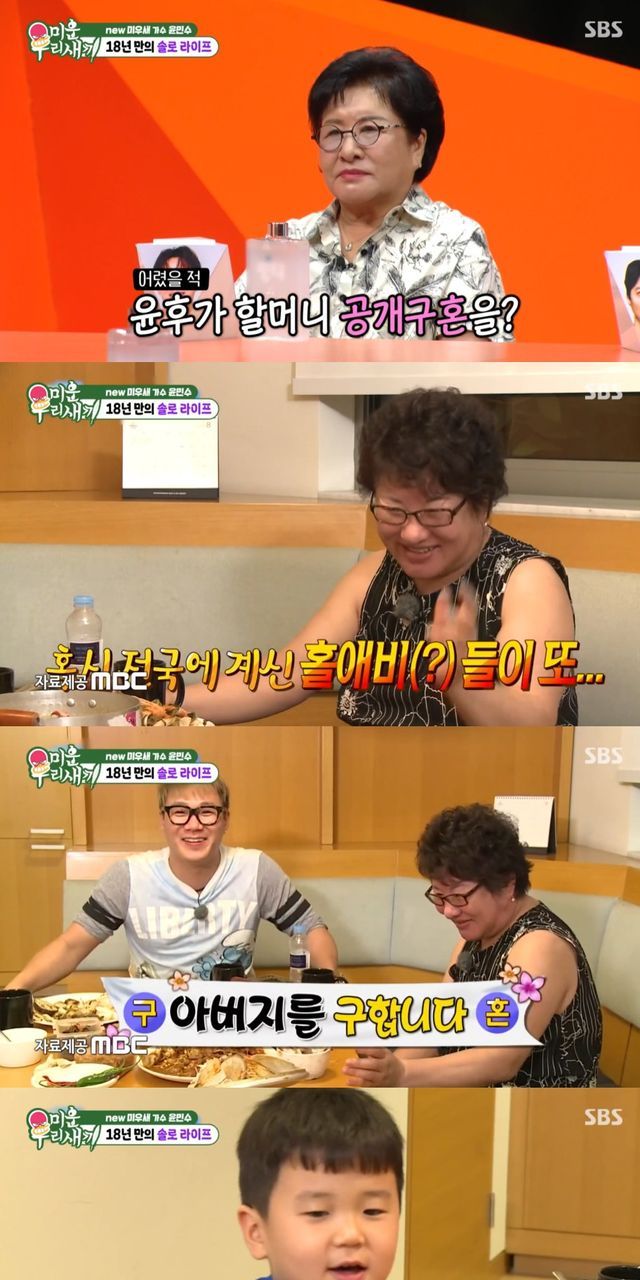 이에 윤민수의 모친은 "혹시 전국에 계신 홀애비들이 또 이거 보고 올랑가 아나"라고 너스레를 떨었고, 윤민수는 "54년 말띠다. 아버지를 구한다. 너도 한마디 해라"라며 어머니의 공개구혼을 도우며 아들 윤후까지 부추겼다.