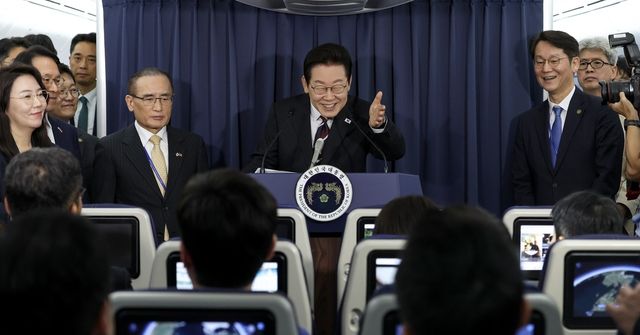 이재명 대통령이 24일(현지 시각) 일본 도쿄 하네다공항 이륙 뒤 미국 워싱턴DC로 향하는 공군 1호기 기내에서 기자간담회를 하고 있다. / 연합뉴스