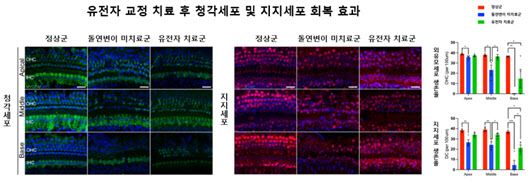 조직 분석에서도 청각세포인 외유모세포(OHC)와 이를 지지하는 지지세포(DC)의 생존률이 유의미하게 증가했고, 달팽이관의 조직 구조도 뚜렷하게 회복됐다. 이는 유전자 교정이 청각세포의 기능뿐 아니라 조직학적 복원에도 실질적으로 기여함을 시사한다.