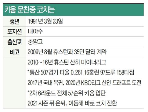 문찬종 코치는 '독특한 이력'의 소유자다. 2009년 4월에 열린 황금사자기 전국고교야구대회에서 충암고의 우승을 이끈 주전 3루수로 국내외 스카우트의 주목을 받았다. 거취를 고심한 그의 선택은 미국. 그해 8월 MLB 휴스턴 애스트로스 구단과 35만 달러(4억원)에 계약하며 태평양을 건넜다.
