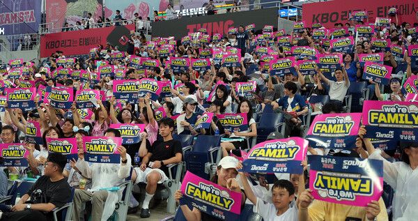 BNK경남은행 임직원과 가족들이 NC 다이노스를 응원하기 위해 ‘We’re FAMILY’가 적힌 응원 피켓을 들고 열띤 응원전을 펼치고 있다.