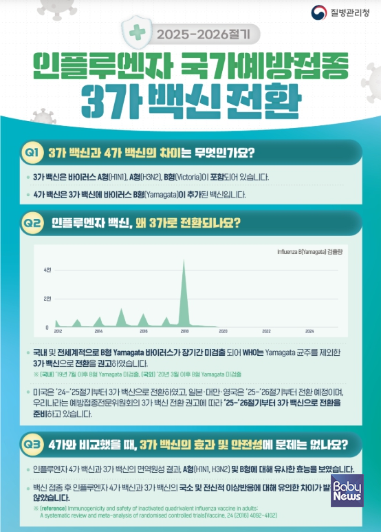 3가 백신은 기존 4가 백신에서, 전 세계적으로 장기간 검출되지 않은 B형 Yamagata 바이러스 항원을 제외한 백신으로, 효과성과 안전성 면에서 4가 백신과 차이가 없는 것으로 확인되었다.