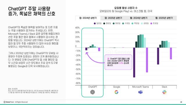 과거에는 주중 중심의 업무용 앱 패턴을 보였으나, 최근에는 주말 사용량까지 증가해 구글 검색 엔진과 유사한 일상 도구로 자리잡아가고 있다.