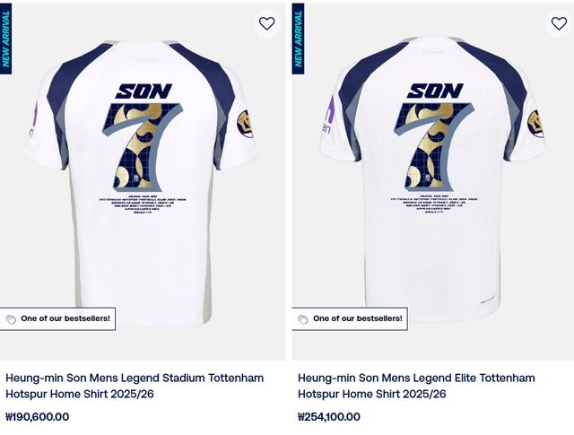 구단 스토어 공식 사이트에는 '손흥민 남자 레전드 스타디움 토트넘 홋스퍼 유니폼 2025-2026시즌'으로 레플리카 유니폼과 엘리트 유니폼, 그리고 우먼스 유니폼을 팔고 있다.