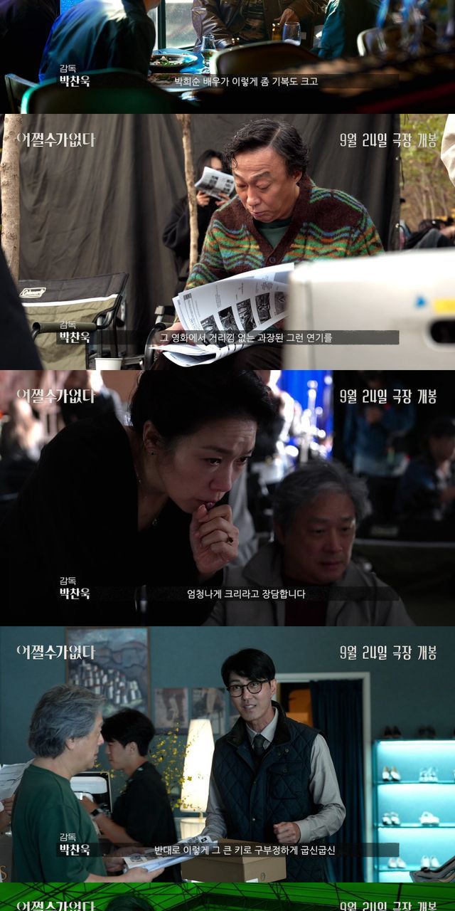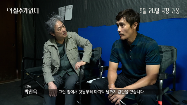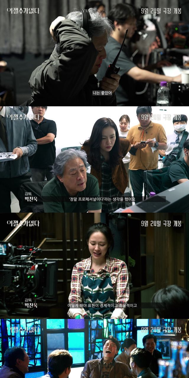 함께 공개된 디렉터스 컷 영상은 박찬욱 감독이 “잘 살고 있던 남자가 해고되면서, 원래의 삶으로 돌아가기 위해서 어떻게 점점 어두운 곳으로 끌려 내려가는지 지켜보는 영화다.”라고 전해 호기심을 끌어올린다. 이어 ‘만수’ 역으로 분한 이병헌에 대해 “정말 많은 표정을 갖고 있고 그것을 필요할 때마다 척척 꺼내 놓을 뿐만 아니라, 빠르게 변할 수 있다는 점에서 감탄했다.”, ‘미리’ 역 손예진에 대해 “새삼스럽게 ‘정말 프로페셔널이다’라는 생각을 했다.”라고 전해 탄탄한 연기 내공을 지닌 배우들의 강렬한 호연을 기대케 한다. 또한 ‘선출’로 분한 박희순에 대해 “기복도 크고 소리도 지르고, 유쾌한 면도 있는 변화무쌍한 캐릭터를 연기했으면 좋겠다고 생각했다.”, ‘범모’ 역 이성민은 “거리낌 없는 과장된 연기를 해본 경험이 있어서, 이번에도 거침없이 했다.”고 전해 이들이 선보일 색다른 모습에 대한 궁금증을 더한다. 여기에 ‘아라’ 역 염혜란에 대해서는 “처음부터 확신을 갖고 있었다.”, ‘시조’ 역 차승원은 “강렬한 인상과 반대되는 굽신거리는 연기를 하면 재미있겠다고 생각했다.”며 극에 남다른 존재감을 더할 배우들의 강렬한 연기를 예고한다. 마지막으로 박찬욱 감독이 “이병헌 배우가 각본을 읽고 제일 먼저 한 질문이 “웃겨도 돼요?”였다. 내 대답은 “웃길수록 좋지”였다.” 고 전한 만큼, 긴장감 넘치는 필사의 생존극에 더해진 아이러니한 유머는 관객들에게 특별한 재미를 전할 것이다. 이처럼 3차 포스터와 디렉터스 컷 영상을 공개한 ‘어쩔수가없다’는 풍성한 볼거리로 9월 극장가를 사로잡을 것이다.
