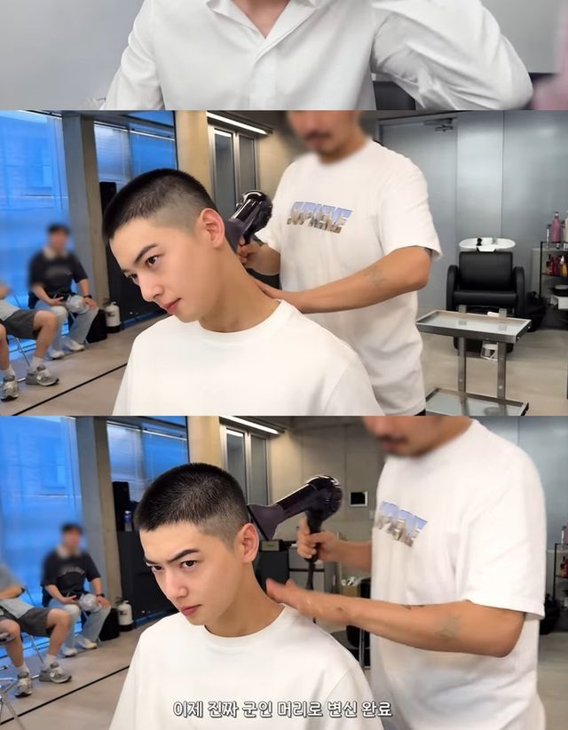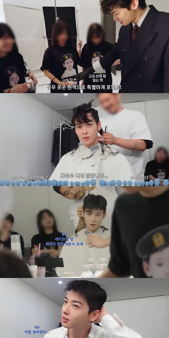 이어 '군인 머리'로 삭발식을 진행하는 모습도 담은 차은우는 "내일이 디데이다. 머리를 자르러 왔다"며 웃음을 터뜨렸다.