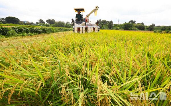 [서울=뉴시스] 25일 경기 화성시 정남면의 한 논에서 열린 2025년 화성시 조생종 벼베기 행사에서 농부가 콤바인으로 벼를 수확하고 있다.