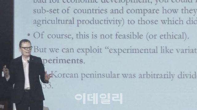 이날 로빈슨 교수는 ‘제도, 정치 그리고 경제성장(Institutions, Politics and Economic Growth)’을 주제로 한 강연에서 한반도는 제도를 중심으로 경제적 성장을 연구하는 관점에서 ‘자연 실험(natural experiment)’과 같다고 했다. 남북한은 분단 이전까지 △유교적 문화 △비슷한 음식과 언어 △정치제도 △언어 등 모든 것이 거의 같았지만, 휴전 이후 서로 다른 제도를 선택하면서 ‘대분기’라고 할 만한 현재의 격차가 발생했다는 것이다.