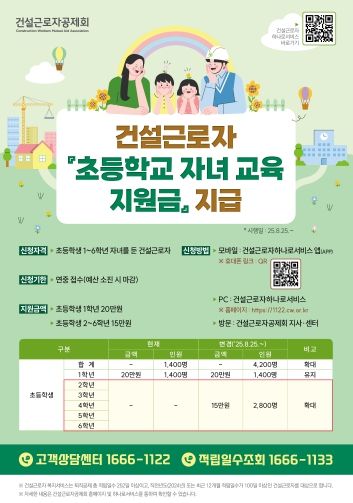 [경기연합신문 ] 건설근로자공제회(이사장 김상인)는 침체된 건설경기를 고려한 건설근로자 추가 지원 대책으로 초등학교 2~6학년 자녀가 있는 건설근로자 2,800명에게 자녀 1명당 15만원의 교육비를 지원한다고 25일 밝혔다. 총 지원 규모는 4억 2천만 원이며, 선착순 마감이다.