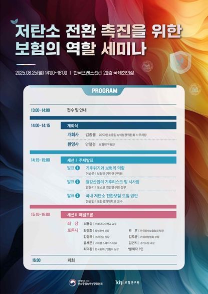 [와이뉴스] 대통령직속 2050 탄소중립녹색성장위원회와 보험연구원(원장 안철경)은 8월 25일 한국프레스센터(서울)에서 ‘저탄소 전환 촉진을 위한 보험의 역할’ 세미나를 개최했다.