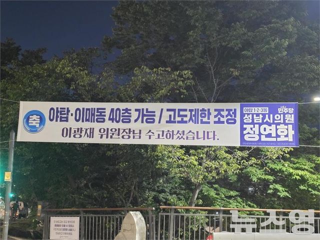 이에 성남시의회 정연화 의원은 지난 22일, ‘야탑·이매동 40층 가능 및 고도제한 조정’과 ‘이광재 지역위원장의 노고에 대한 감사’를 표하는 현수막을 게시하며 성남시민과 성과를 기념했다.