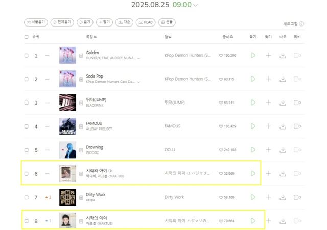 두 곡은 25일 오전 9시 기준 기준 멜론 톱100 차트에서 각각 8위와 6위에 올랐다. 현재 차트 1위는 넷플릭스 ‘케이팝 데몬 헌터스’ OST 열풍 속에 ‘골든’이 굳건히 지키고 있으며, 이어 블랙핑크의 ‘점프’, 올데이 프로젝트의 ‘페이머스’, 우즈의 ‘드라우닝’ 등이 뒤를 잇고 있다. 이들 사이에서 두 곡의 선전은 같은 노래라도 완전히 다른 출처와 색깔로 대중의 선택을 받을 수 있음을 보여준다. 특히 기성 가요계에서 탄탄히 자리 잡은 마크툽과 달리 유튜브 채널을 기반으로 활동해 온 박다혜가 나란히 톱10에 오른 사실은 국내 음원 차트가 이제 전통적 가수와 크리에이터가 동등하게 경쟁하는 무대가 됐음을 상징한다는 분석이다.