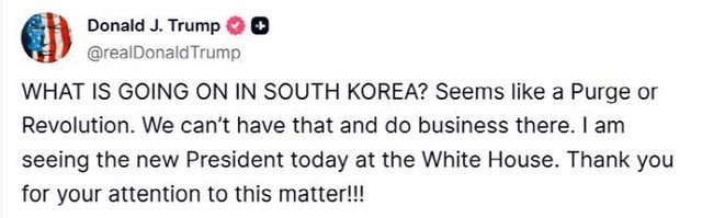 트럼프 대통령은 회담 당일 오전 자신의 소셜미디어에 “한국에서 숙청(Purge)이나 혁명(Revolution) 같은 일이 벌어지고 있는 것 같다”며 “이런 상황에서 어떻게 사업을 하겠는가”라고 언급해 논란을 불렀다. 이 대통령과의 정상회담을 2시간 40분 앞두고 올라온 이 글에 회담 자체가 무산될 가능성까지 제기됐다.