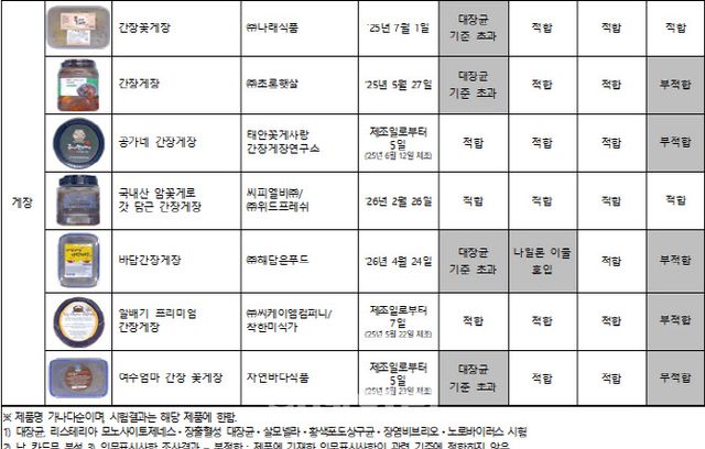 게장 4개 제품은 대장균이 검출돼 관련 기준에 부적합했고, 게장 1개 제품에서는 이물(나일론 끈)이 검출됐다.