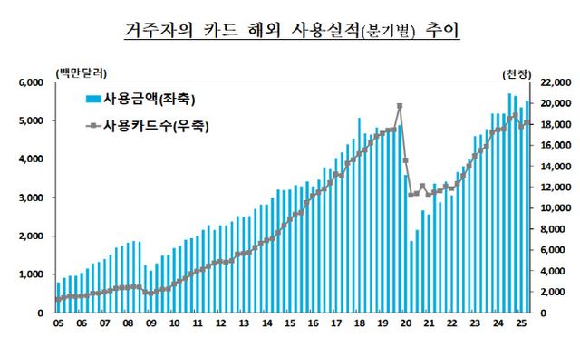 한국은행이 26일 발표한 ‘2025년 2분기 거주자의 카드 해외 사용실적’에 따르면 올해 2분기 거주자의 카드(신용·체크) 해외 사용금액은 55억 2000만달러로 전년동기(53억 5000만달러)보다 3.3% 증가했다. 전년동기(51억 9000만달러)에 비해서는 6.5% 늘었다.