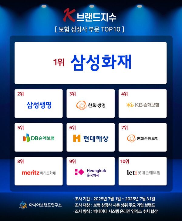 한정근 아시아브랜드연구소 대표는 "국내 보험 산업은 전통적으로 신뢰와 안정성을 기반으로 성장해왔지만 최근 디지털 전환과 소비자 경험 관리가 브랜드 경쟁력을 좌우하는 핵심 요인으로 자리 잡았다. 이번 K-브랜드지수 보험 상장사 부문에서는 삼성화재가 브랜드 신뢰도를 효과적으로 유지하며 1위를 차지했다"고 설명했다.