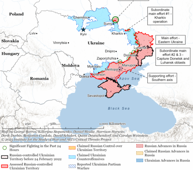 러시아의 첫 번째 요구 사항은 우크라이나 전쟁의 핵심 지역인 돈바스(도네츠크와 루한스크) 지역에 대한 러시아의 완전한 지배와 우크라이나가 이 지역을 포기하는 것이다. 현재 러시아가 이 지역의 88% 정도를 점령한 상태다. 또한 자포리자와 헤르손 지역의 전황을 동결하는 것으로, 현재 러시아는 이 지역의 73% 정도를 점령하고 있다.