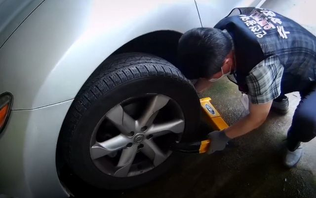 지난 5월 실시한 단속에서 적발된 차량 바퀴에 잠금 장치를 연결하는 모습 / 인천시 제공