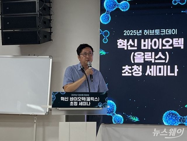 이동기 올릭스 대표가 허브토크데이 혁신 바이오텍(올릭스) 초청 세미나에서 발표하고 있다. / 사진=현정인 기자