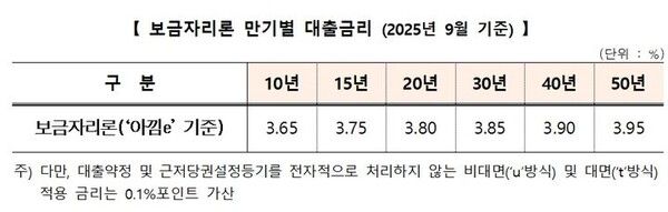 뉴시스 보도에 따르면, 이에 따라 '아낌e-보금자리론' 기준으로 연 3.65(10년)~3.95%(50년) 금리가 적용된다.