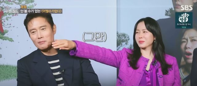 옆에 있던 이병헌은 피식 웃더니 "저는 사실은 두 사람이 함께 추는 춤인데 제가 약간 어설프게 추면 미리가 저를 약간 가이드해 주고 이렇게만 하는 역할이기 때문에..."라며 입을 열었다. 이때 손예진은 이병헌을 툭툭 치며 "그 다음 무슨 얘기를 하려고"라며 말렸다. 심지어 "스탑!"이라며 이병헌 입을 막으려는 제스처를 취했다.