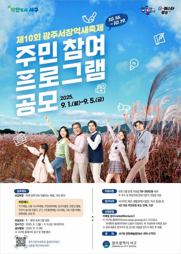 광주 서구는 올해로 10회를 맞이한 서창억새축제 주민참여 프로그램 공모전 참여자를 모집한다고 26일 밝혔다.