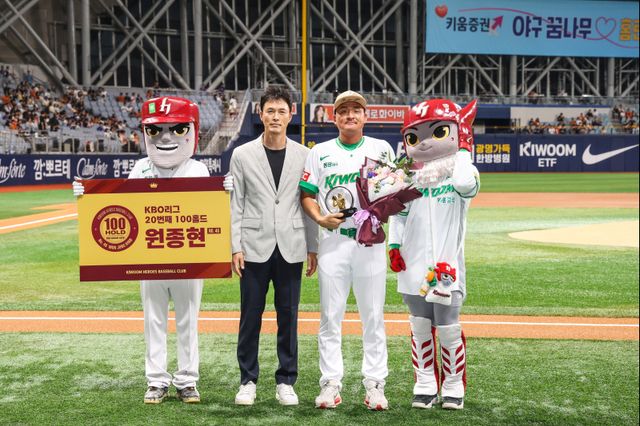 키움 히어로즈가 26일 서울 고척 스카이돔에서 펼쳐지는 한화 이글스와 경기에 앞서 투수 원종현(38)의 KBO리그 역대 20번째 100홀드 달성을 기념하는 시상식을 실시했다.