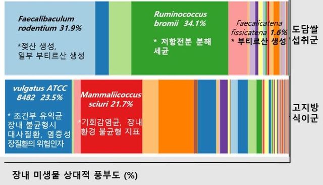 실험군 분변 속 미생물을 분석한 결과, ‘도담쌀’ 급여군에서 저항전분을 분해하는 대표 유익균(루미노코커스 브로미, Ruminococcus bromii) 비율이 34.1%로 높았고, 장 점막을 보호하고 염증을 억제하는 낙산균도 1.6% 나타났다. 두 균주는 서로 밀접한 관계를 맺으며 장 건강에 좋은 영향을 주는 것으로 확인됐는데, 고지방식만 급여한 실험군에서는 전혀 검출되지 않았다.