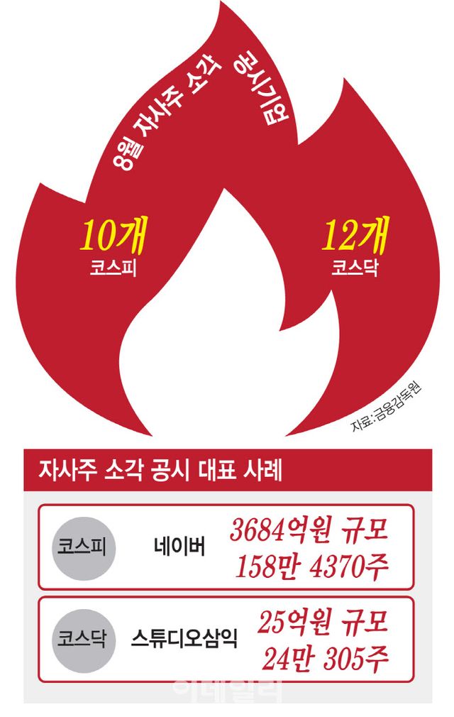 코스피 상장사 중에선 대표적으로 네이버가 지난 5일 공시를 통해 3684억원 규모의 자사주 158만 4370주를 소각하기로 결정했다. 네이버 측은 “주주 환원을 위해 매년 1%씩 3년간 자사주를 소각하겠다고 밝힌 계획의 일환”이라고 설명했다. 코스닥 상장사 중에선 스튜디오삼익(415380)이 주가안정 및 주주가치 제고를 위해 자사주 24만 305주를 소각하겠다고 전날 공시했다. 소각 예정금액은 약 25억원이다.