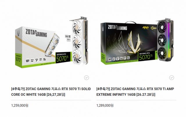 조텍코리아가 지포스 RTX 5070 Ti 그래픽카드 2종을 대상으로 특가 이벤트를 진행한다. ZOTAC GAMING GeForce RTX 5070 Ti AMP Extreme Infinity와 ZOTAC GAMING GeForce RTX 5070 Ti SOLID CORE OC White가 포함된다.