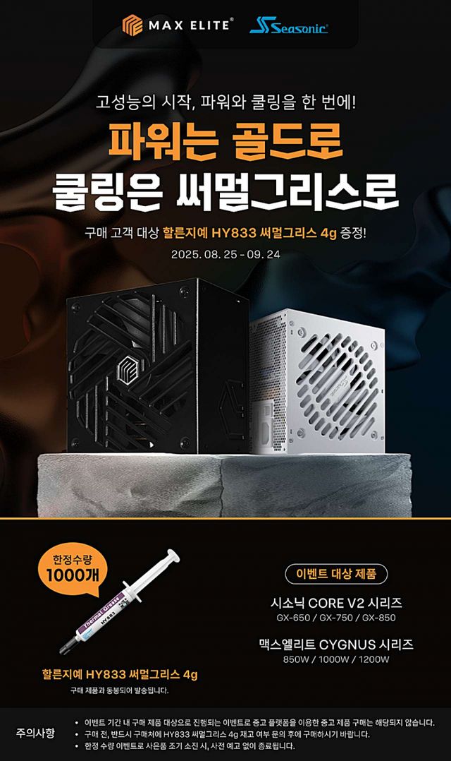 행사는 8월 25일부터 9월 24일까지 진행되며, 시소닉 CORE V2 시리즈(GX-650, GX-750, GX-850)와 맥스엘리트 STARS CYGNUS 시리즈(850W, 1000W, 1200W) 제품 구매 고객에게 할른지예 HY833 써멀그리스(4g)를 증정한다. 사은품은 1,000개 한정 수량으로, 구매 제품과 함께 발송되며 소진 시 별도 공지 없이 조기 종료될 수 있다.