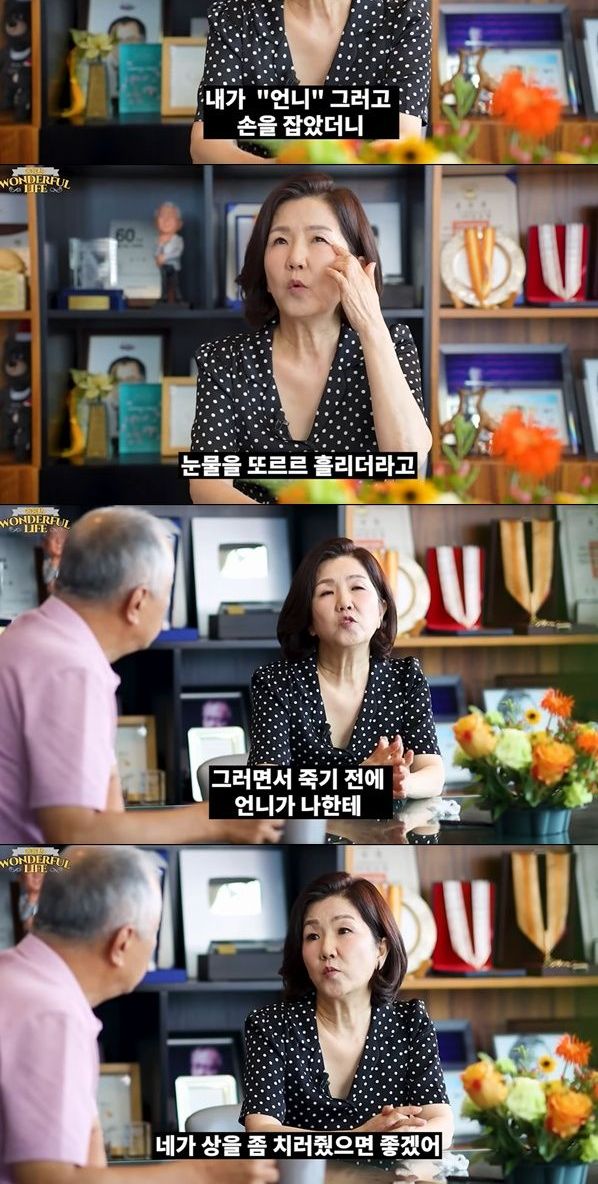 이어 "잊을 수 없는게 자옥 언니가 연명 치료를 한다고 여기를(목) 뚫었다. 그래서 얼굴에다 뭘 씌우고 있는데 내가 '언니' 그러고 손을 잡았더니 눈물을 또르르 흘리더라. 그게 마지막이다. 죽기 전에 언니가 나한테 '나 죽으면 네가 상을 좀 치러줬으면 좋겠어' 라고 이야기했다"고 밝혔다.
